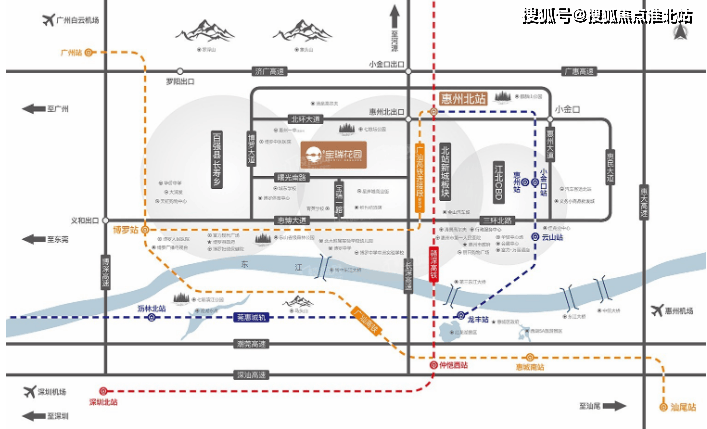 【轨道】可抵达惠州最大交通枢纽,集散地惠州北站。乘坐赣深高铁,即达深圳北;另外,还可达江西赣州西站。乘坐莞惠轻轨,可达东莞常平站;