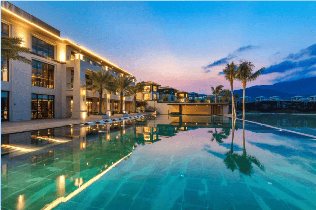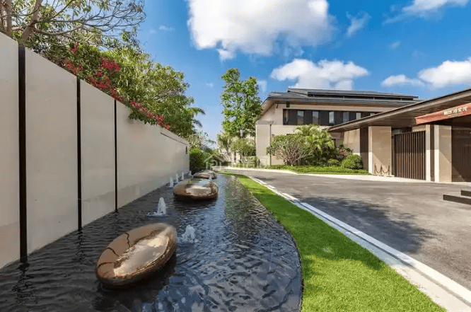 建筑风格为新亚洲风格,外立面采用葡萄牙米黄哑光石材,搭配深色陶瓦,营造“素墙黛瓦”的东方意境。