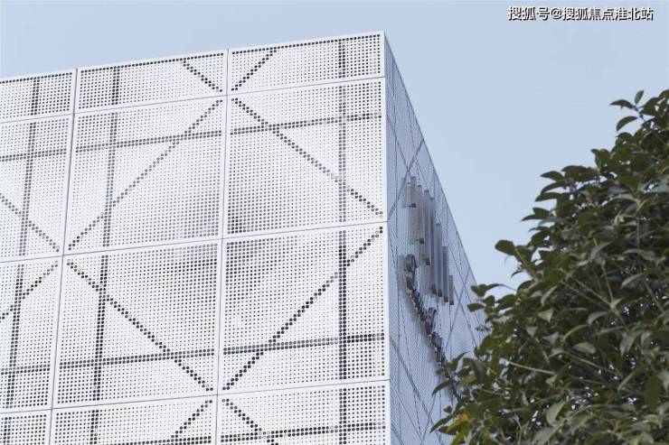 考虑制造周期及施工便利,穿孔铝板幕墙采用单一基本单元拼接形态多样性。单一基本单元可复制比例高,工厂内机械完成框架切割及线路预埋,省去普通钢构及土建现场加工、砌筑时间,现场安装迅速。项目穿孔铝板基本单元大小1.44M*1.44M。