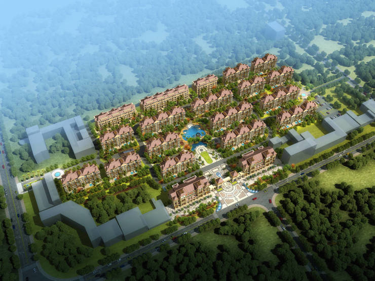 建筑风格:采用东南亚和欧式风格,建筑造型为坡屋顶及小坡檐形式,立面首层采用石材,呈三段式,与几何景观结合,气派美观。