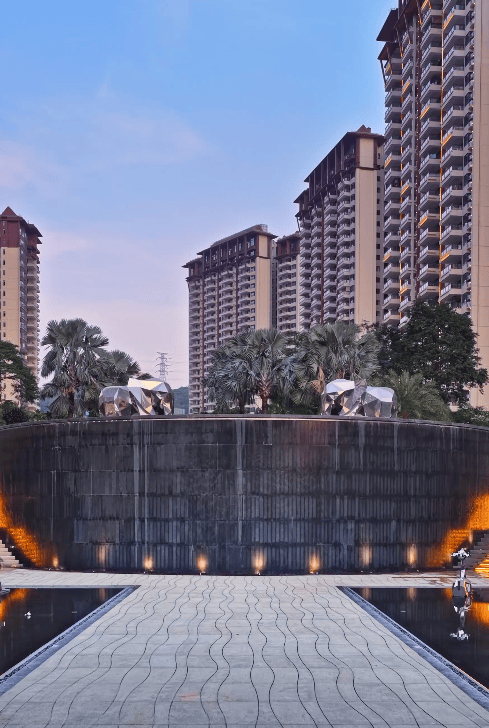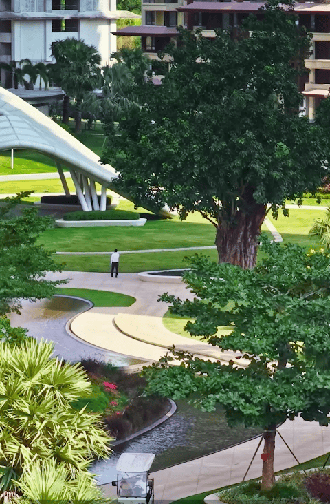 踏入悦菩提,一场关于自然与匠心的旅行才刚刚开始。十米高的叠水瀑布 1000 多㎡的浅水系溯流水景,是社区为业主呈现的第一重园林丽景 —— 不同于传统水景的疏离感,这里的水流特意设计得平缓而清澈。