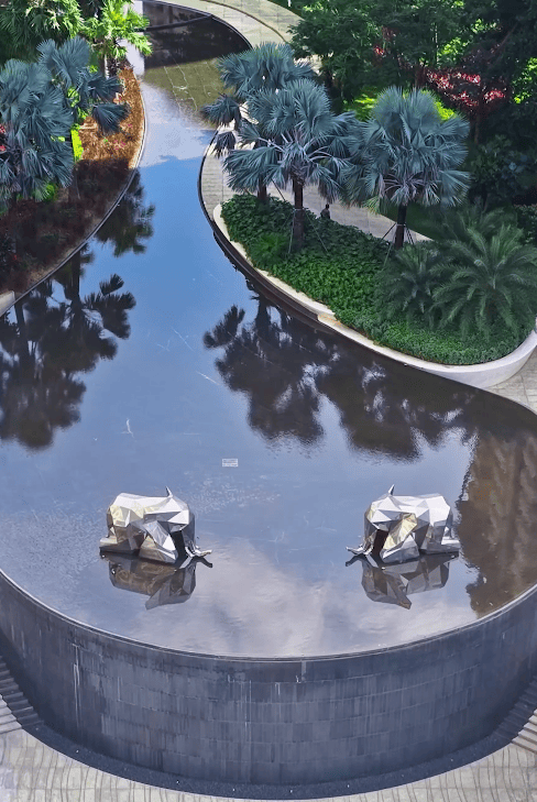 午后会有孩子光着脚踩在手工铺设的鹅卵石上,感受水流漫过脚踝的清凉。每一块鹅卵石都经过景观团队的精心挑选和手工排布,从圆润度到色泽搭配都暗藏巧思,当阳光穿过树叶的缝隙洒在水面上,波光与石影交织出一片流动的碎金。