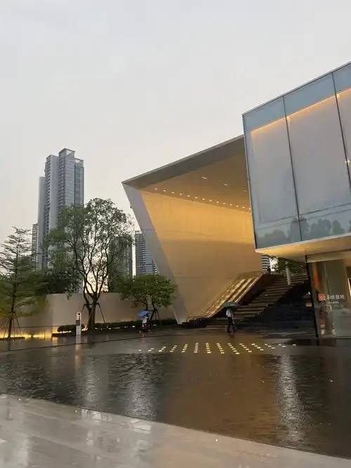 外立面:全蜂窝铝板 + 大面积玻璃,弧线屋檐 + 叠山纹,辨识度高。