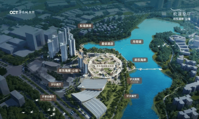基本信息:项目位于东莞松山湖 CBD 月荷湖旁,即松山湖北站附近。占地面积约 12 万㎡,总建筑面积约 25 万㎡,其中住宅约 13 万㎡,欢乐海岸约 7.6 万㎡,大剧院约 4.4 万㎡。绿化率 20%,容积率 1.0,楼栋总数为 3 栋,总户数 84 户,车位数 549 个。开发商为东莞松山湖华侨城投资开发有限公司。
