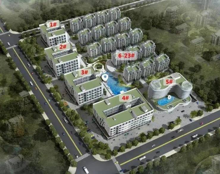 社区内部:约 18000㎡下沉式景观广场、1000㎡流水瀑布下沉泳池、亲子水上乐园、8000㎡风情商业街;园林为 “一心三区六景” 热带风格;精品酒店(5# 楼,77 间客房)配套餐饮、康体服务;
