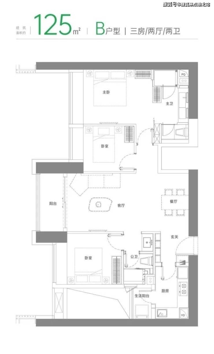 B户型 建面约125㎡三房两厅两卫