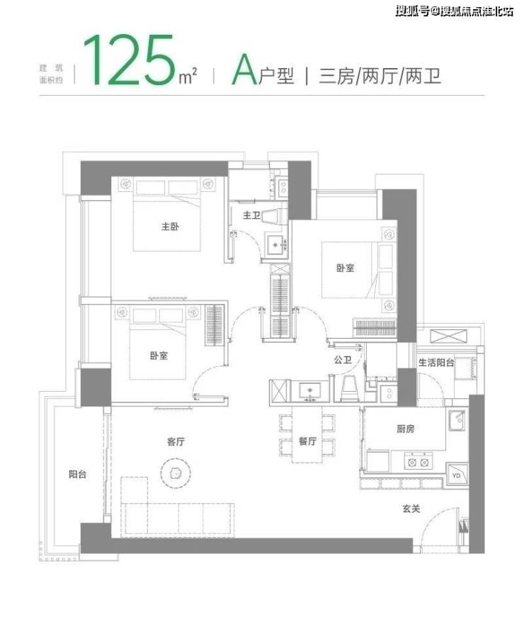 A户型 建面约125㎡三房两厅两卫