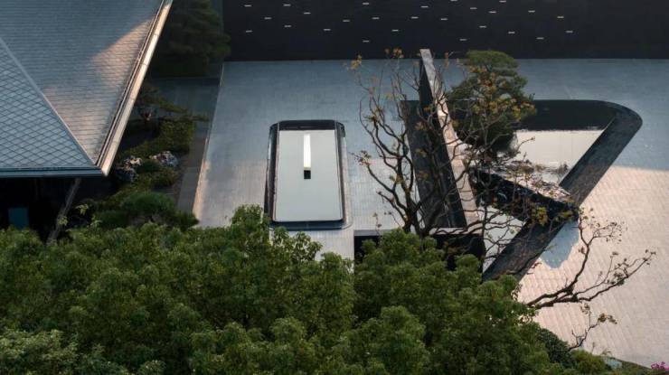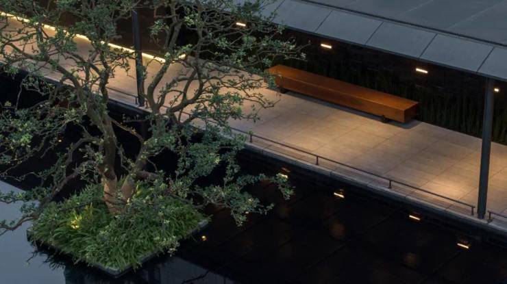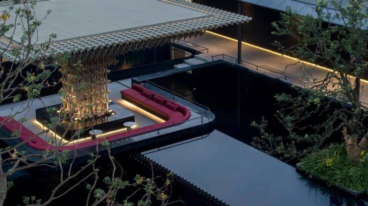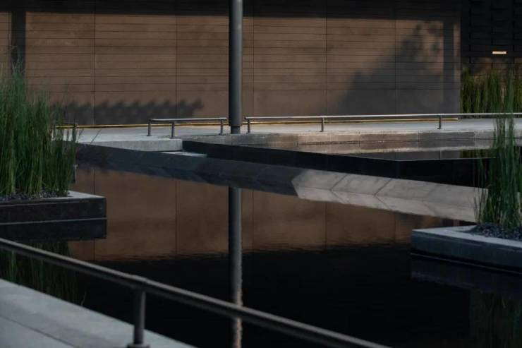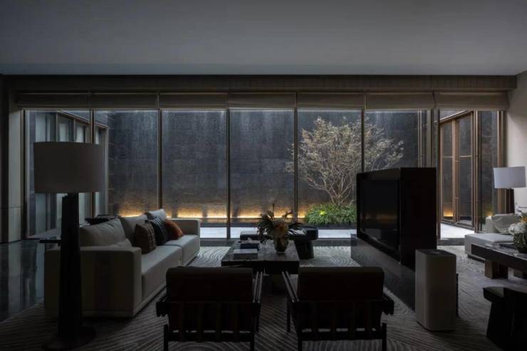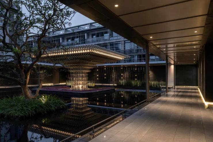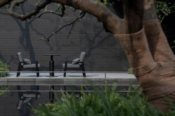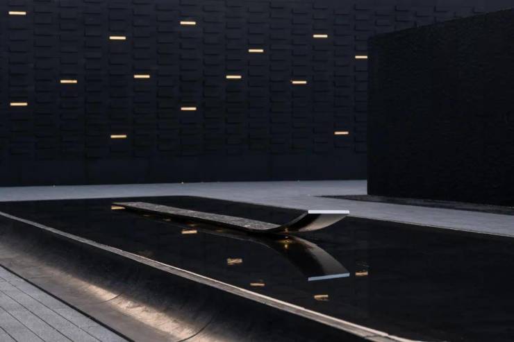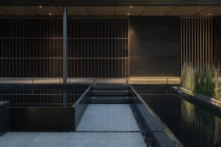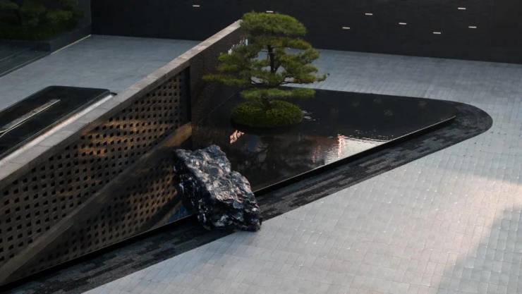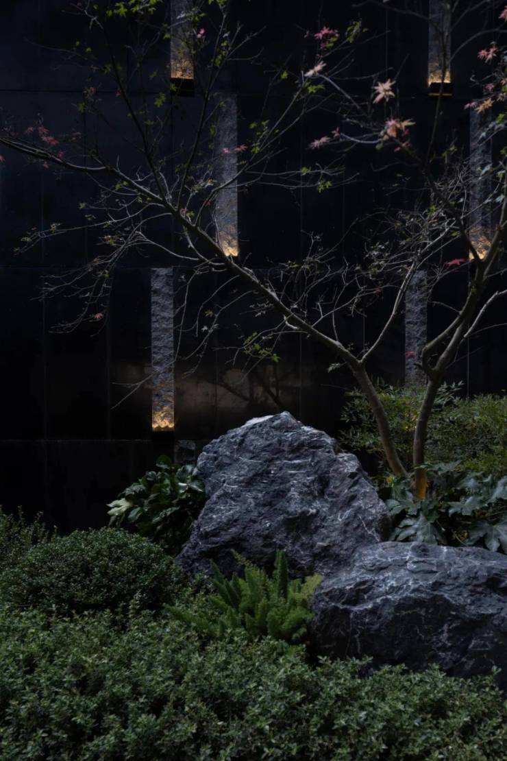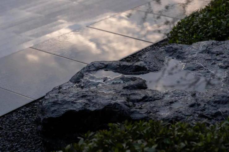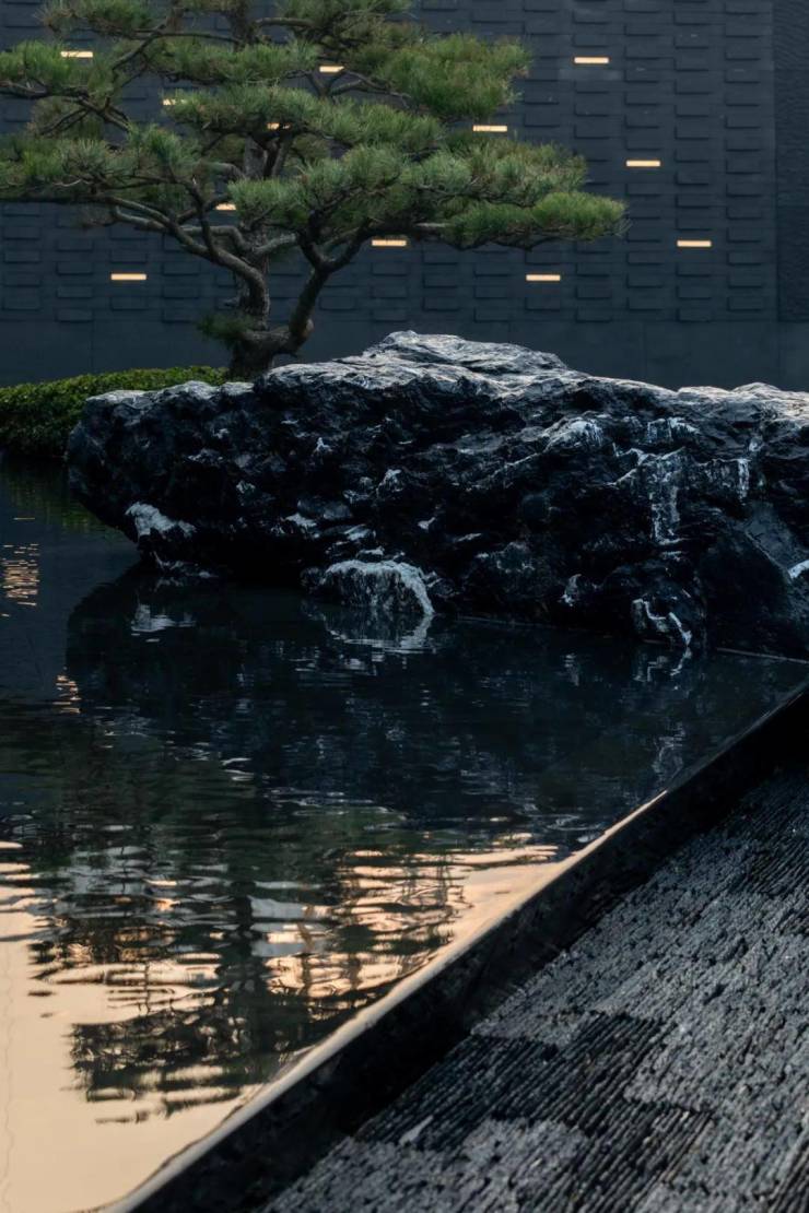 下沉庭院与空间全方位渗透,强调东方美学的人文气质。流水景墙垂直度高达6米,以钢结构骨架干挂,墙体石材采用中国黑花岗石横向拉槽处理,形成匀速下落水幕。毛石元素的融入展示人文印刻的痕迹。