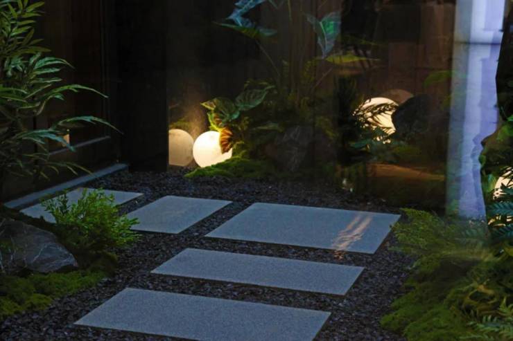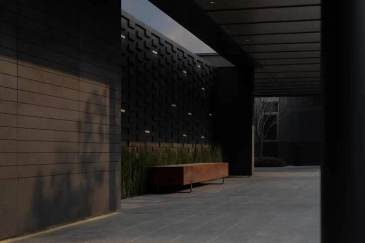 行馆式归家体验彰显东方礼序的底蕴与尊贵感。入口结合空间尺度,选用黑山石作为点景置石,与主景造型黑松、镂空福鼎黑垒石景墙组合成景,营造至简至静的门庭气质。景墙围合式入口与典雅大堂共同打造归家仪式礼序感,享“出则繁华,入则静谧”。