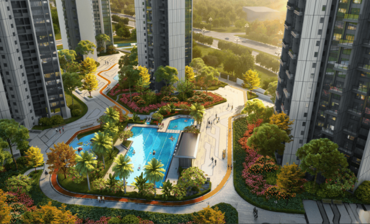 小区配套:小区内有全龄段儿童游乐区,配置滑梯等设施,还设有赛道泳池。此外,项目规划有总建面约 16 万平的大型商业综合体,采用下沉式公园景观设计,打造退台式空中花园。