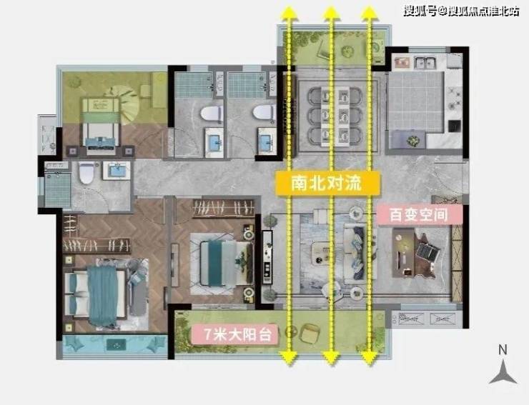 约7米瞰景大阳台,南望一线梅江生态园景观,在家即见优美的自然生态环境,葵林风光、水鸟蹁跹尽收眼底,让风景融入生活,让身体在此休憩,让精神在此栖居。