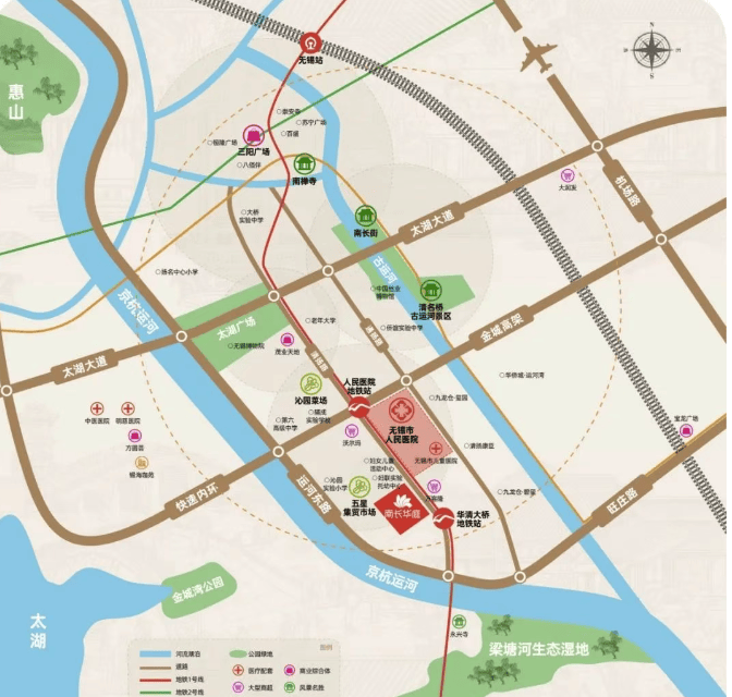 景观配套:周边环绕 48.3 万方梁塘河湿地公园、67 万方太湖广场,三公里范围内有南长街、清名桥、古运河景区、中国丝业博物馆、无锡博物院等。