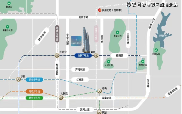 交通配套:项目交通极其便捷,作为双地铁上盖物业,直连接驳 7 号线笋岗站,未来 17 号线(建设中)也将在此交汇。周边还有罗湖北站(建设中)及罗湖站(升级规划建设中)等高铁枢纽,且北环大道、深南中路、滨河大道、红岭北路等城市主干道环绕。