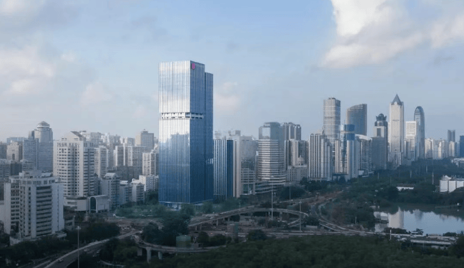建筑设计:采用半隐框玻璃幕墙技术,搭配双层 LOW-E 超白玻璃幕墙,外观高级,与滨海商务场景完美契合,且坚固防震、隔音保温性能突出,已获得 LEED 金级认证。约 11.7 米的挑高大堂,搭配花岗岩地面和石膏板吊顶,彰显商务气质。