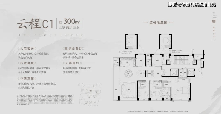 建面约300㎡户型样板间,独立电梯厅,形成入户缓冲区,提升归家隐私,入户门选用钢木装甲门与五合一智能门锁,为安全加码,独立玄关背景墙,打造生活双动线与高拓展收纳柜。五房两厅四卫的布局,实现三套房与中西厨设计,空间尺度与居住舒适度皆具。