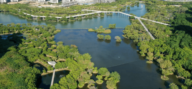 项目特色:项目镶嵌在东岸湿地公园内,坐拥山海湿地公园景观资源,公园环抱部分绿化面积超 80%,自然环境优越。建筑由国际知名设计团队担纲设计,将现代简约与中式古典完美融合,具有独特美学风格。