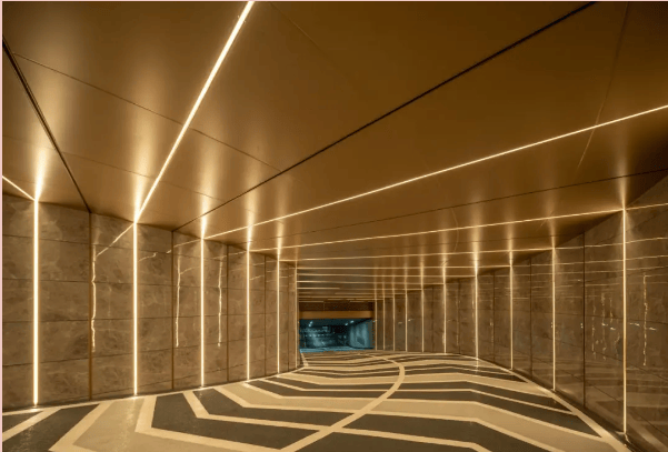 设有地上、地下双重归家动线,车库入口采用希腊灰奢石岩板、铝板与金属格栅打造,坡道设发光灯膜,营造梦幻归家体验。