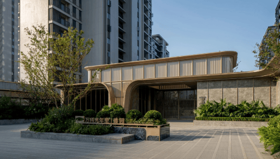 社区入口以万科经典的 V 形字符为灵感,打造环岛落客区,两层立体造型搭配弧形顶冠,采用希腊灰、普拉达绿奢石岩板与琥珀金铝板,尽显尊贵。