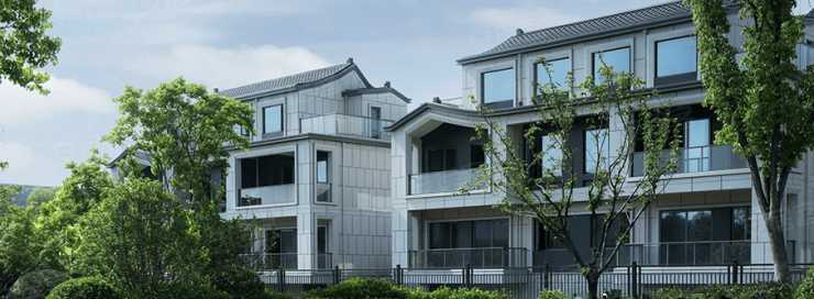 建筑设计独特:融合传统越地民居经典元素,采用线条石材与线条铝板的质感立面,搭配三层中空玻璃门窗和 “人字形” 坡屋顶,既美观又实用。