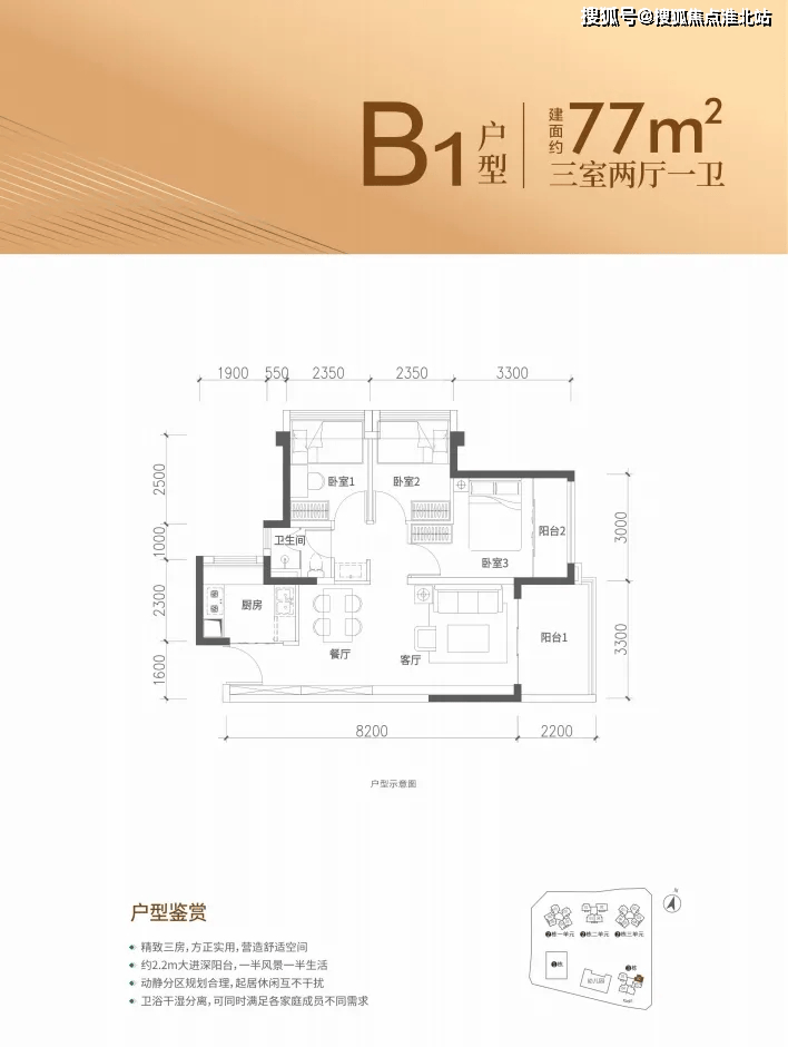 77㎡的3房2厅1卫,设计的是竖厅格局,客厅3.3米开间,进深8.2米,3个卧室分别做到了主卧11.3㎡/次卧7.28㎡/次卧7.28㎡(包含墙体飘窗),得房率约88.31%(包含赠送),东南朝向。