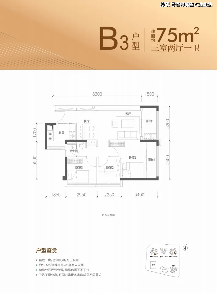 75㎡的3房2厅1卫,设计的是竖厅格局,客厅3.2米开间,进深8.3米,3个卧室分别做到了主卧13.06㎡/次卧6.8㎡/次卧5.22㎡(实测面积,去掉墙体飘窗),得房率约91%(包含赠送),东南朝向。