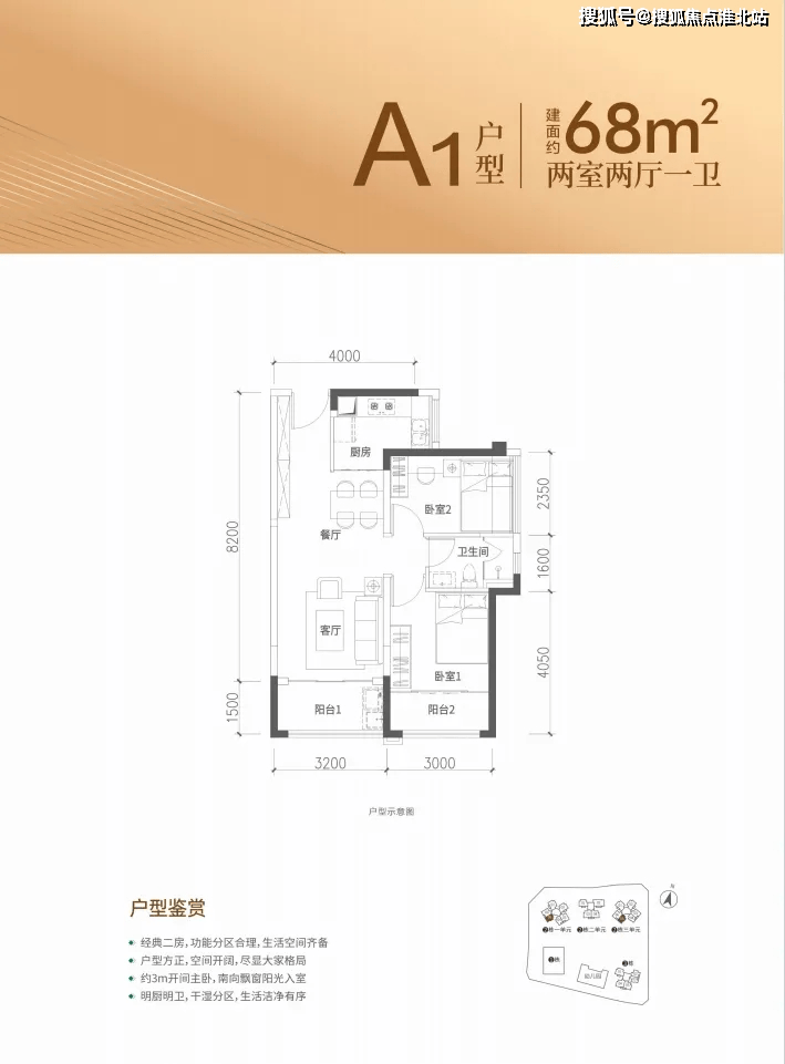 68㎡的2房2厅1卫,设计的是竖厅格局,客厅3.2米开间,进深8.2米,,2个卧室分别做到了主卧11.55㎡/次卧7.74㎡(实测面积,去掉墙体飘窗),得房率约88%(包含赠送),西南朝向。