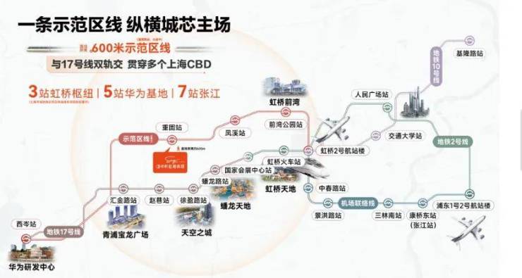 「保利虹桥和颂」之所以能称得上是宝藏盘,首当其冲的优势便是站位未来能级不亚于2号线的示范区线(在建),且与站点的直线距离约500米。