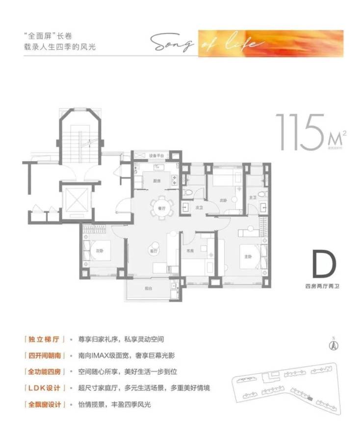 建面约115㎡4房2卫户型做到了同面积段罕见的四开间朝南+四房设计,南向IMAX级景观面,卧室阳光满溢,功能性也拉满。