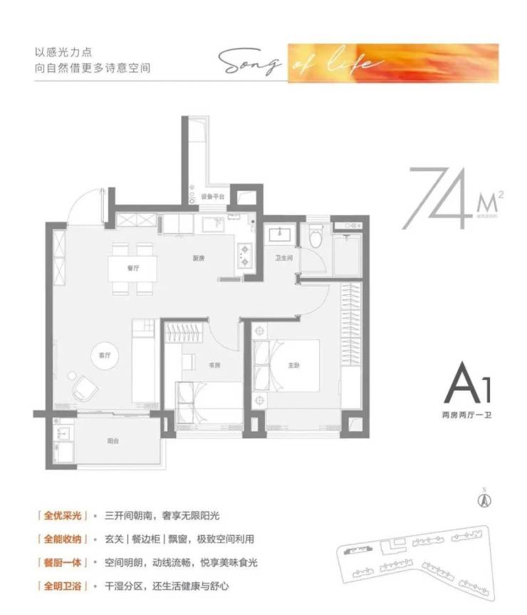 建面约74㎡2房竟做到三开间朝南,其中两卧均朝南,同时面宽甚至大于进深,这比同类产品卧室一南一北狭长布局要舒适得多。