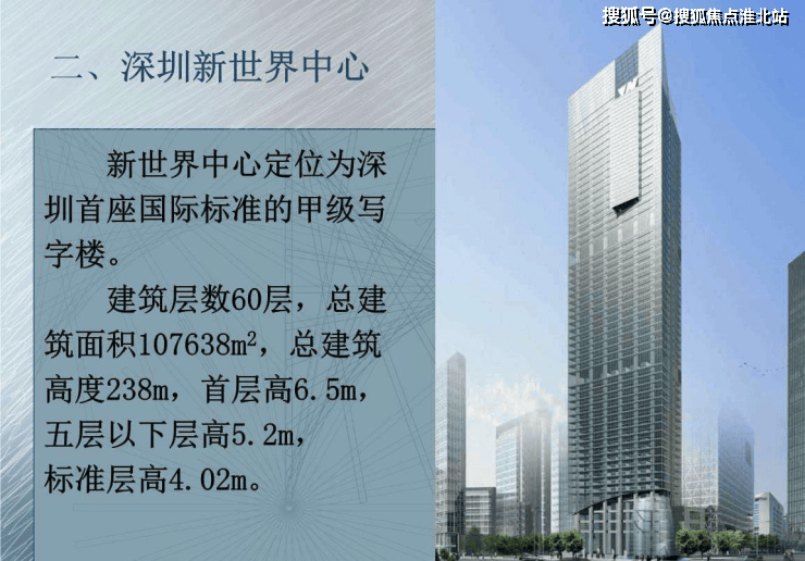 位于福田区中心的新世界商务中心,建成时是深圳最高建筑物,是美国顶级设计公司SOM在珠三角的首个写字楼作品,也是深圳平均造价最昂贵的写字楼。