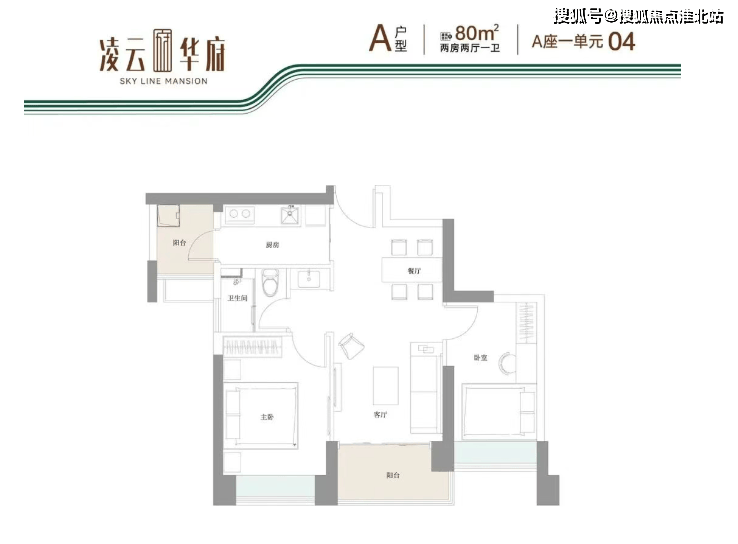 80㎡的 2 房 2 厅 1 卫:设计为双龙抱珠格局,三开间朝南,一字型厨房,还带 1 个生活阳台,客厅阳台东南朝向。