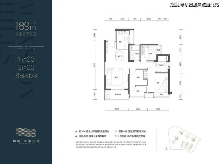 03户型:89㎡的3房2卫,设计的经典竖厅格局,客厅3.5米开间,三开间朝南,L型厨房,3个卧室做到了2.5/2.8/3.2米的宽度,都是东南朝向