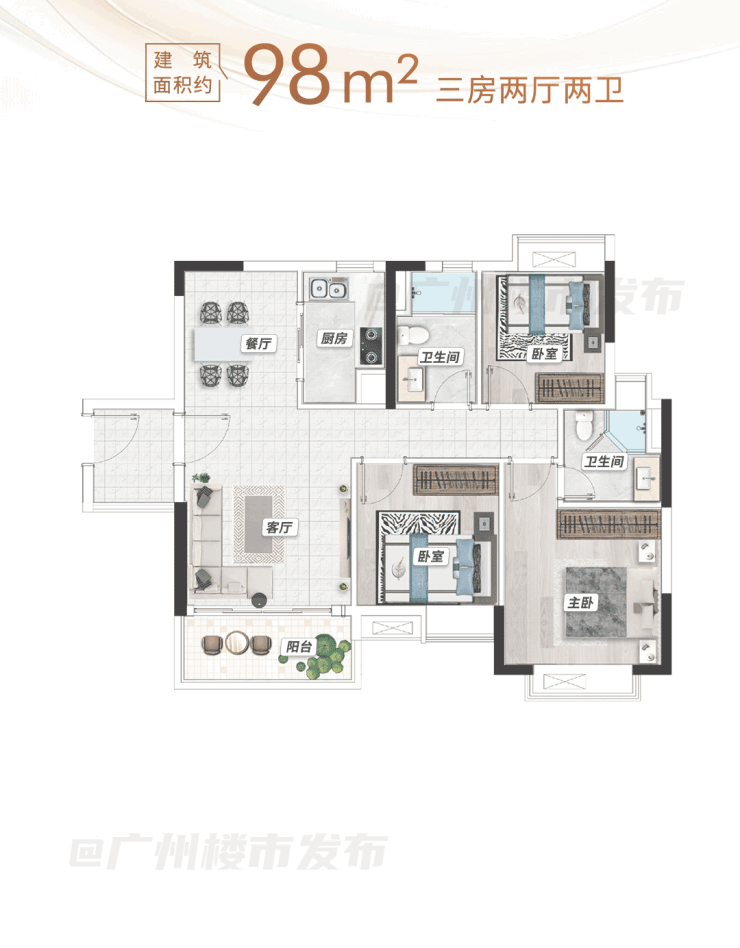 以约98平户型为例,客厅、主套、次卧都朝南,整体的舒适度和采光都考虑到位。