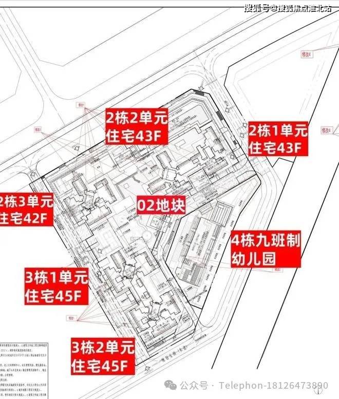 02地块:总占地面积约1.78万㎡,总建筑面积约19.7万㎡,计容建筑面积约13.7万㎡,容积率7.71,绿化率30%,共由5栋42-45层高住宅组成,分别是2栋1/2单元住宅43层,2栋3单元住宅42层,3栋1/2单元住宅45层,4栋配建1所9班幼儿园。
