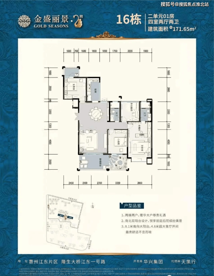 全新14、16号楼,荣耀绽放 占据二期地块最中心位置,远离噪音干扰,安静舒适;每个户型全南向、南北通透、采光好、呈点式分布,双电梯大堂设计,配备东芝品牌电梯、高层单位新开河、东江及金山湖美景,一览无余;16号楼为板式建筑结构,南向200米楼间距,每户为170㎡大面积户型,舒适度极佳;四周环绕园林景观,匹配8.1米长阔景阳台,景观极佳,视野无任何遮挡,每户可欣赏泳池、园林等景观;尊享一梯一户,私密度、安全性极高;二、项目区位