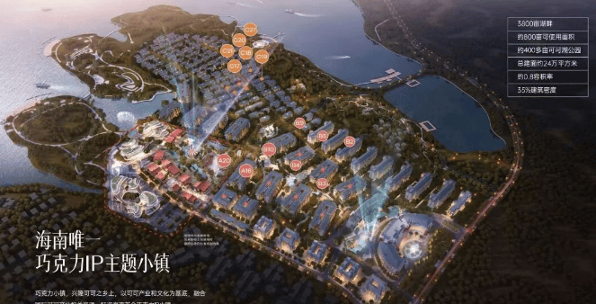 基本信息:总占地约 370 亩,总建面约 25 万㎡,是海南岛首个以巧克力为 IP 主题的 “全家庭亲子度假乐园”。