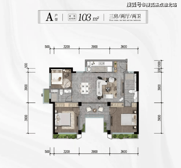 约 105㎡三室两厅两卫:经典改善户型,三开间朝南,客厅面宽约 4.2 米,与餐厅一体化设计,连接 6 米观景阳台,视野开阔;主卧套房配备独立卫浴与衣帽间,私密性强,适合中长期居住。