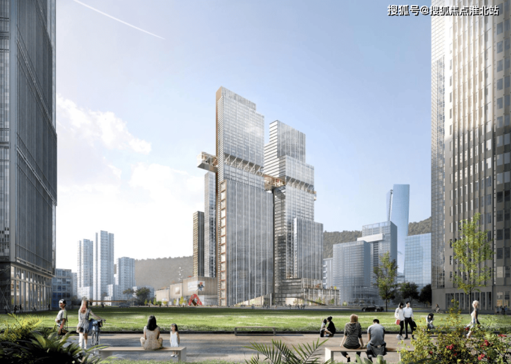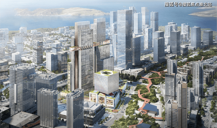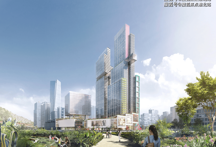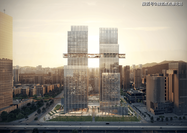 这个以交通为导向的高层开发项目(TOD)设计由多个扁长的体块层叠组成,从中心向外高度迭级下降,形成两座塔楼。两座塔楼在高区部分设有一条空中连桥连接,这使建筑具有强烈的方向性,两端分别指向前海湾和南山。塔楼的低区部分呼应了与之毗邻的周边环境的尺度,包括片区内的一个主要公共公园——“丝路长廊”。