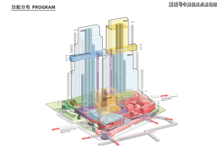 一座立方体造型的建筑悬浮于裙楼之上,在这座综合体和公园之间形成视觉联系。高度逐渐下降形成的屋顶露台,如同城市公园的延伸。立体化的流线将公共和私人功能区联系在一起,连接着各个楼层。