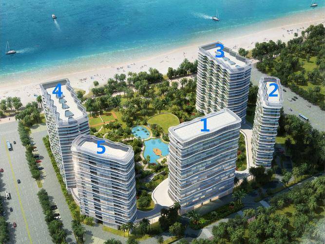 规模指标:总占地 53 亩(约 3.53 万㎡),总建面约 12.4 万㎡;容积率 2.5,绿化率 40.6%;共 5 栋楼(U 型布局,2/3/4 栋为可售公寓,1/5 栋为配套五星酒店);总户数 880 户;车位数 637 个(地上 98、地下 525);园林由香港贝尔高林设计,配约 800㎡无边海景泳池、300㎡健身中心、瑜伽室、禅意室、业主餐厅、儿童游乐区。