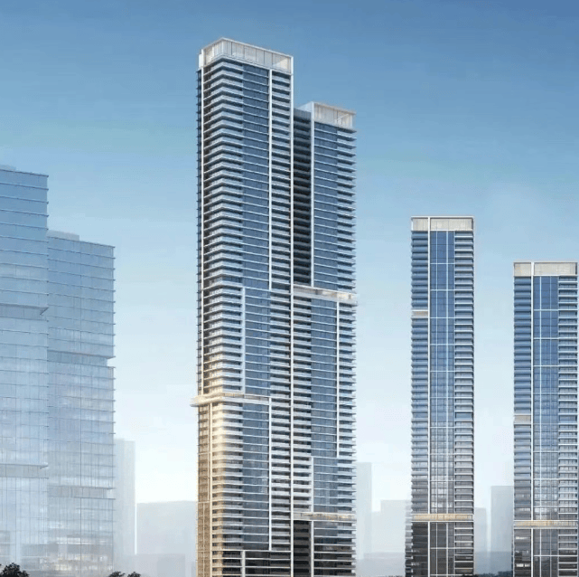 建筑与装修:外立面采用大面积玻璃幕墙 + 铝板,阳台墙面也使用铝板,客餐厅厨房等公区地面采用高端石材,厨电卫浴选用杜拉维特、汉斯格雅、西门子等一线高端品牌,客厅拥有 270° 景观视野。