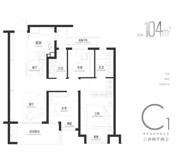 建面约 104㎡3 房:经典南向三开间动静分离设计,入户玄关柜收纳能力强。约 15.5㎡主卧大套房南北贯通,带独立卫生间与飘窗,还可改造衣帽间。南向一厅双卧 + 4.5m 观景阳台,居住舒适。