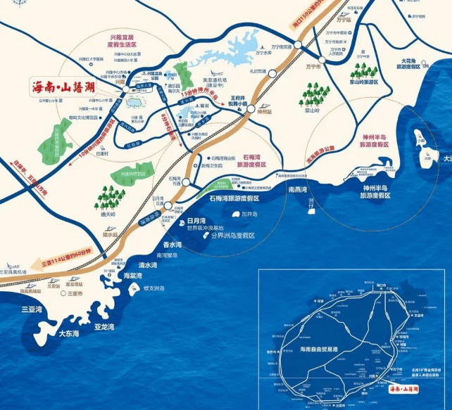 配套设施:内部设有业主食堂、泳池、棋牌室等,打造了现代艺术风景观,有中心湖及沿湖栈道。周边交通便利,距离东线高速兴隆 / 神州半岛出口约 500 米、环岛高铁神州站约 2 公里。教育方面,6 分钟车程可达第四小学,临近第一中学。15 分钟车程可达万宁人民医院,二十分钟车程可达王府井商场、兴隆商业风情街,周边还有热带植物园、巴厘村等旅游景点。