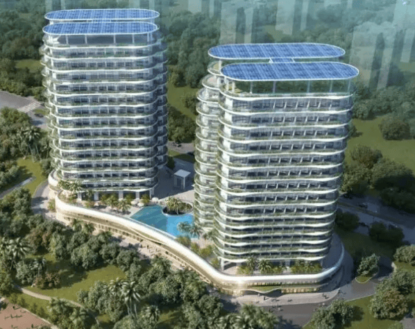 内部:3 层6.8 米架空层(无边泳池、健身房、空中花园、全日制餐厅)、1-2 层裙楼商业、B 栋 4-10 层洲际假日酒店(托管)