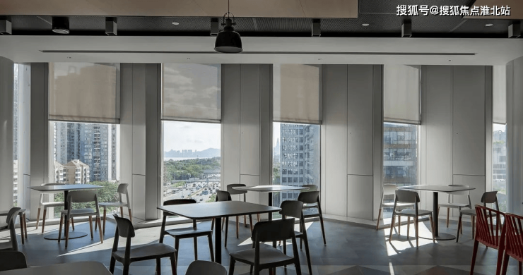 设计为滨海云中心带来了独特的视觉效果,即东、西向强烈的视觉反差。从滨河大道由东往西方向会看到一个150米高的石头房子,而从西向看过来,它又是一个全玻璃建筑。塔楼的形态逻辑在裙房部分也得到延伸与反转。塔楼凸折形在裙房部分成为了凹折形,45°形态亦延伸至裙房架空层吊顶、咖啡厅外墙、下层广场洞口轮廓、景观地面等部位。