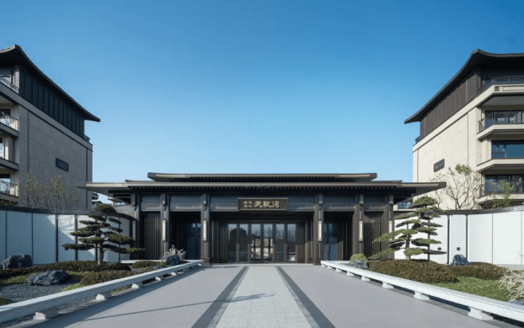 建筑特色:采用新中式风格,建筑主体色调与山水融合,外立面上以米白和深咖色作搭配,外墙以多彩漆为主、局部干挂石材,应用天敔湾定制敔字纹、万字纹等中式吉祥纹样,展现出典雅的中式韵味。