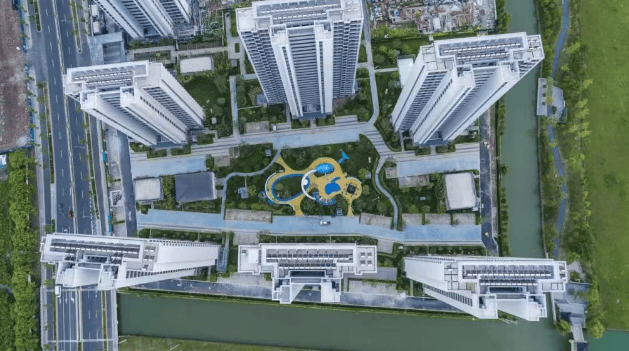 景观设计:项目规划了中轴对称的布局,将礼序和景观兼顾。项目中央设有一个 100m×75m 超大花园,西、北两侧的水系借景入园,创造出充满诗意的绿色生活空间。