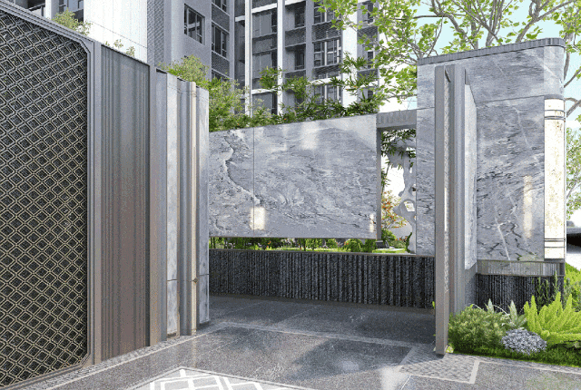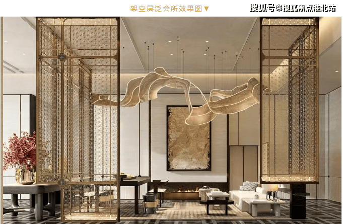 望族奢境,府藏天地,从佛山的岭南古韵吸取灵感,以多种岭南古韵的特色元素,四方门、屏风、漏窗、花墙、满洲窗等细节元素融合新工艺经过二次设计后融合景观设计尊崇归家动线