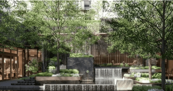 项目塑造别样自然基底的归家入口,由开放纷扰过渡到静谧精致,悠享人文归家路;社区园林通过曲水、寻园、望亭、观澜等元素,打造曲水绕园、围水庭院的立体山水空间,突破视野极限,勾勒以水景为基底的游赏庭院,叠水流瀑,营造隐贵的自然生活画卷,建立城市与自然之间的平衡。