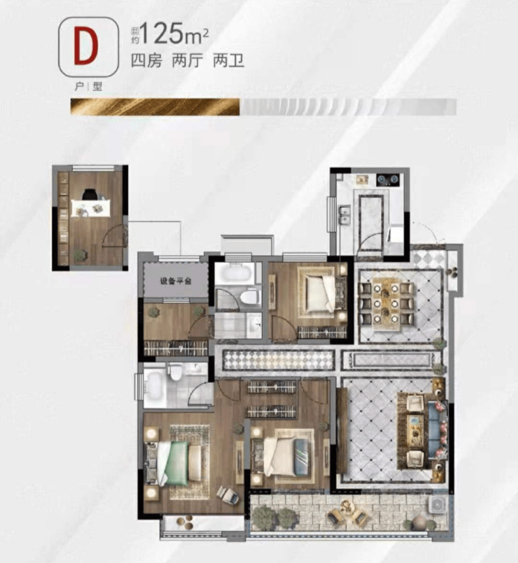 125㎡4房2厅2卫:125㎡户型做了小4房设计,功能性很强,户型整体非常方正,3室朝南,主卧是一个套房,北向的设备平台可以利用起来改造成一间卧室。